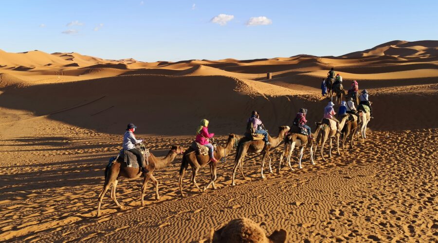 After breakfast, your journey leads to the spectacular Todgha Gorges, where 300-meter-high cliffs form a breathtaking canyon. You will take a walk through this dramatic landscape before enjoying lunch. In the afternoon, the adventure continues to the captivating Erg Chebbi dunes near Merzouga. Here, you will trade your vehicle for a camel and enjoy a peaceful ride across the golden sands. As the sun sets, you’ll arrive at your luxury desert camp, where you will savor a traditional dinner by a campfire, listen to Berber music, and sleep beneath a sky filled with stars.