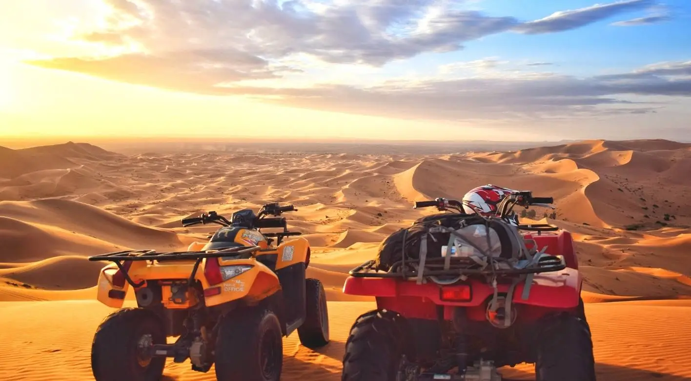 Unleash your inner adventurer in the Merzouga desert. Here, you can experience the ultimate thrill of commanding your own quad bike. To begin, arrive at our base on the edge of the iconic Erg Chebbi dunes. Our professional team will then greet you and get you fully equipped for your ride. Next, you will receive a comprehensive safety briefing. Our expert guides also provide clear instruction to ensure you feel confident. After that, you’ll start your engine and launch your journey into a golden sea of sand.